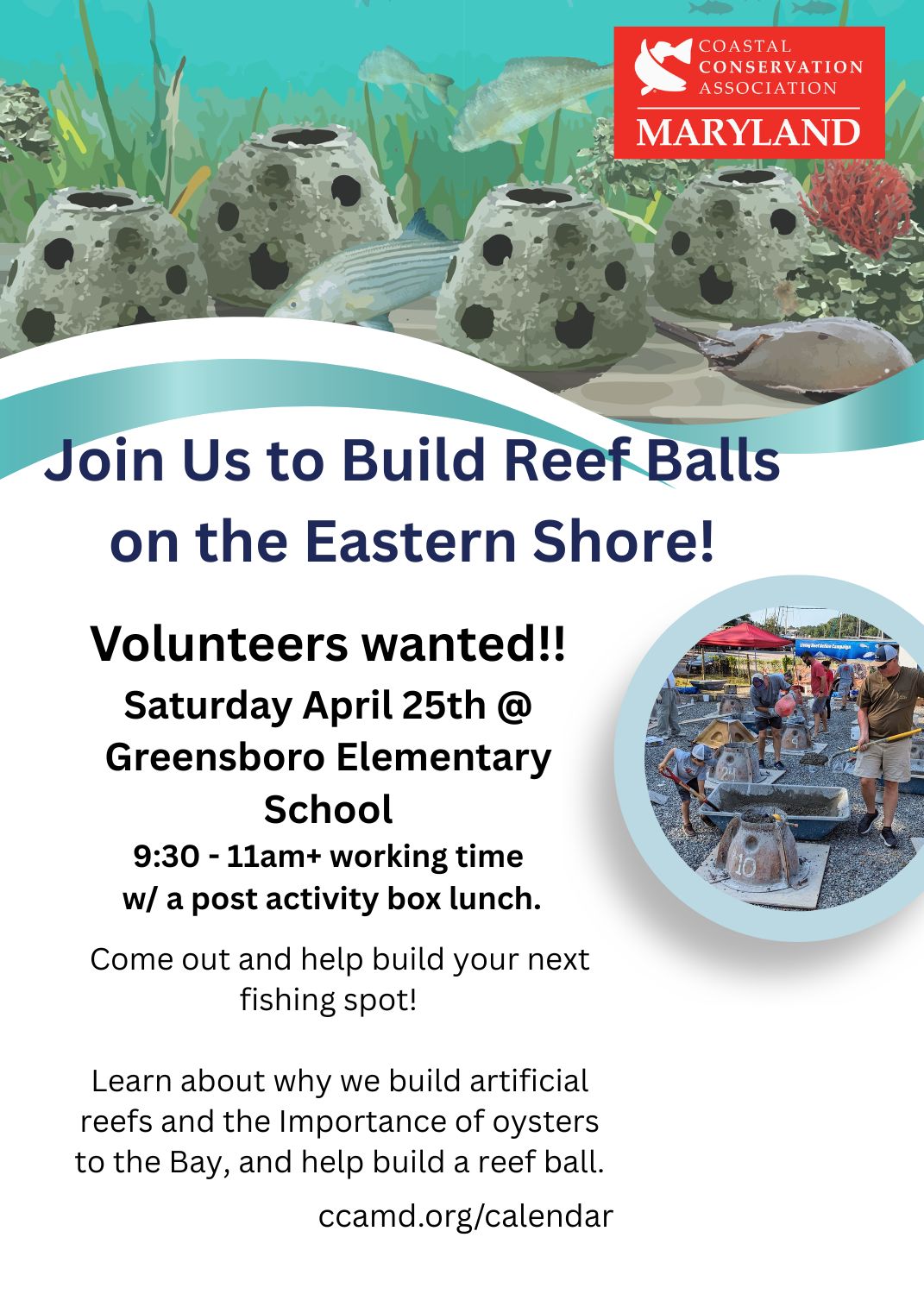 CCA Maryland has partnered with Kelly Generator & Equipment, Inc. to host a private, hands-on reef ball building event, allowing participants to directly contribute to restoring critical marine habitat in the Chesapeake Bay. If your company, school, or organization would like to schedule a private two-day reef ball building experience like the one featured in this...