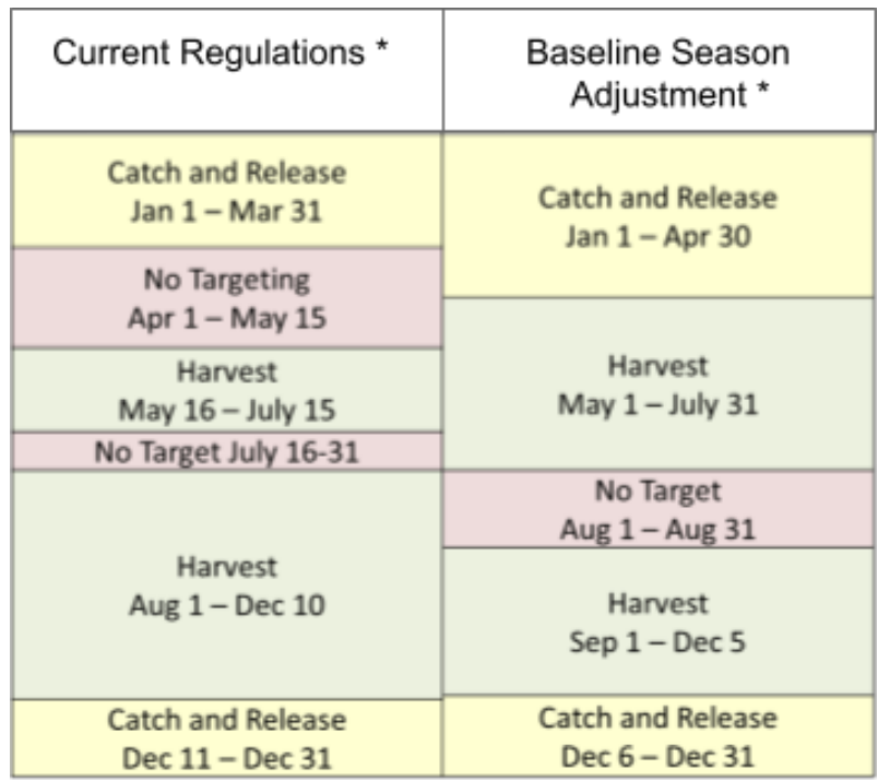 - Moving the non-targeting closure from July 16-31 to August 1-31, providing more protection for the fish while they are stressed from summer heat and depleted oxygen conditions that occur in July and August.